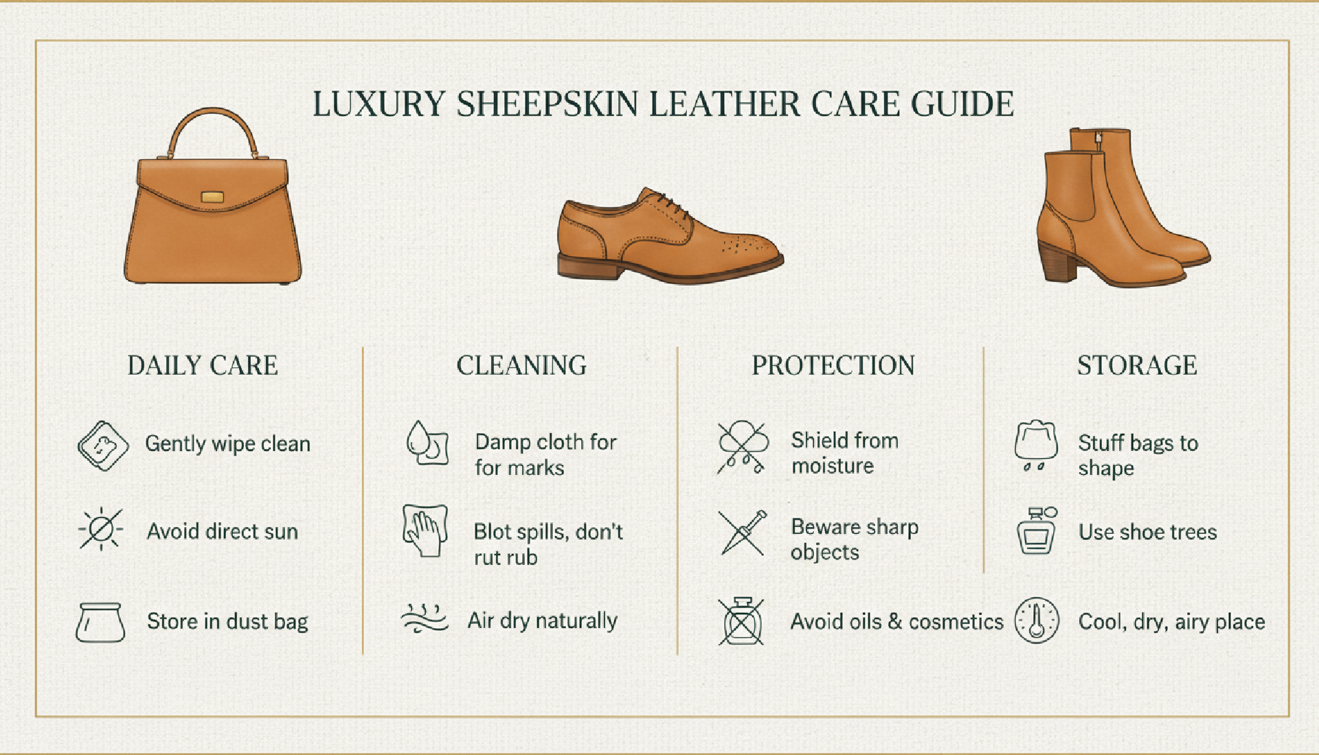 Condition: Apply a high-quality leather conditioner every 6-12 months to maintain suppleness.